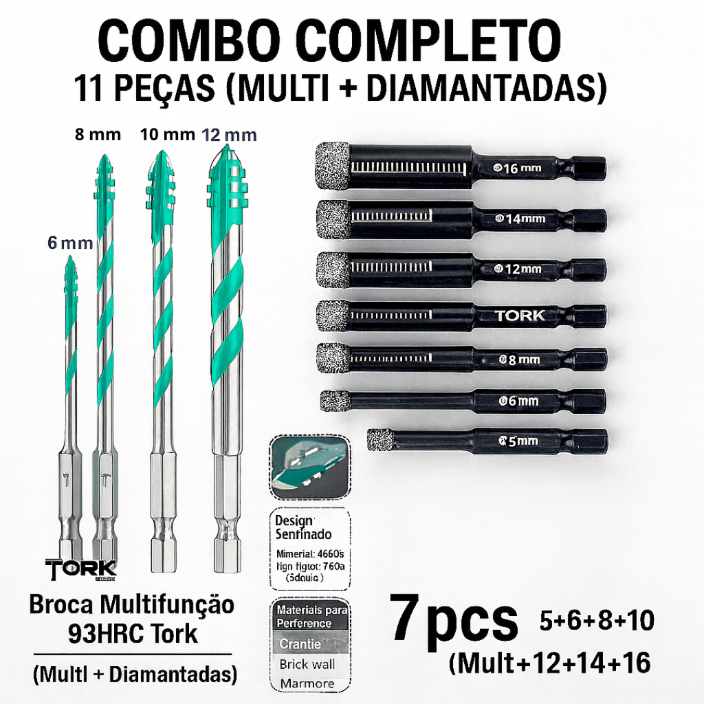 A Broca Multifunção Tork 93HRC foi desenvolvida para quem exige precisão, potência e durabilidade em qualquer situação. Fabricada em aço de liga leve YG6A , com dureza profissional de 93HRC , ela é até 30 vezes mais resistente que as brocas comuns, mantendo desempenho superior mesmo em uso contínuo.