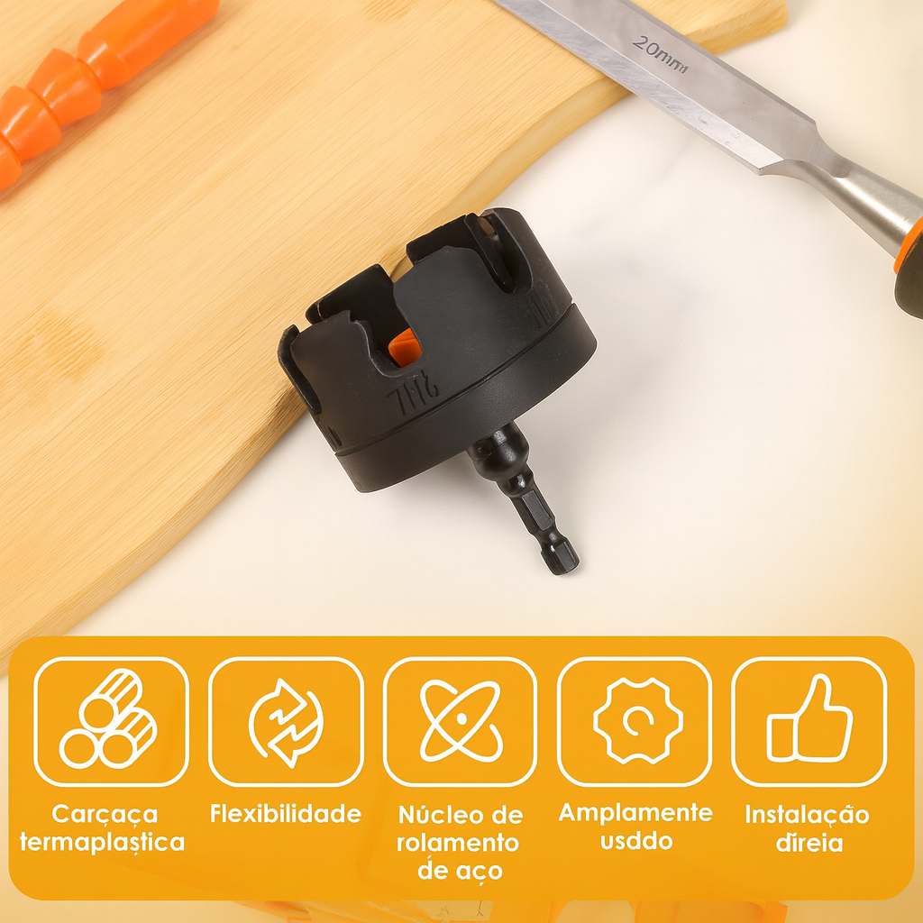 Construção robusta: Corpo em carcaça termoplástica resistente a impactos e núcleo de rolamento em aço, garantindo durabilidade mesmo em uso intenso.